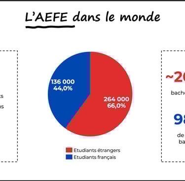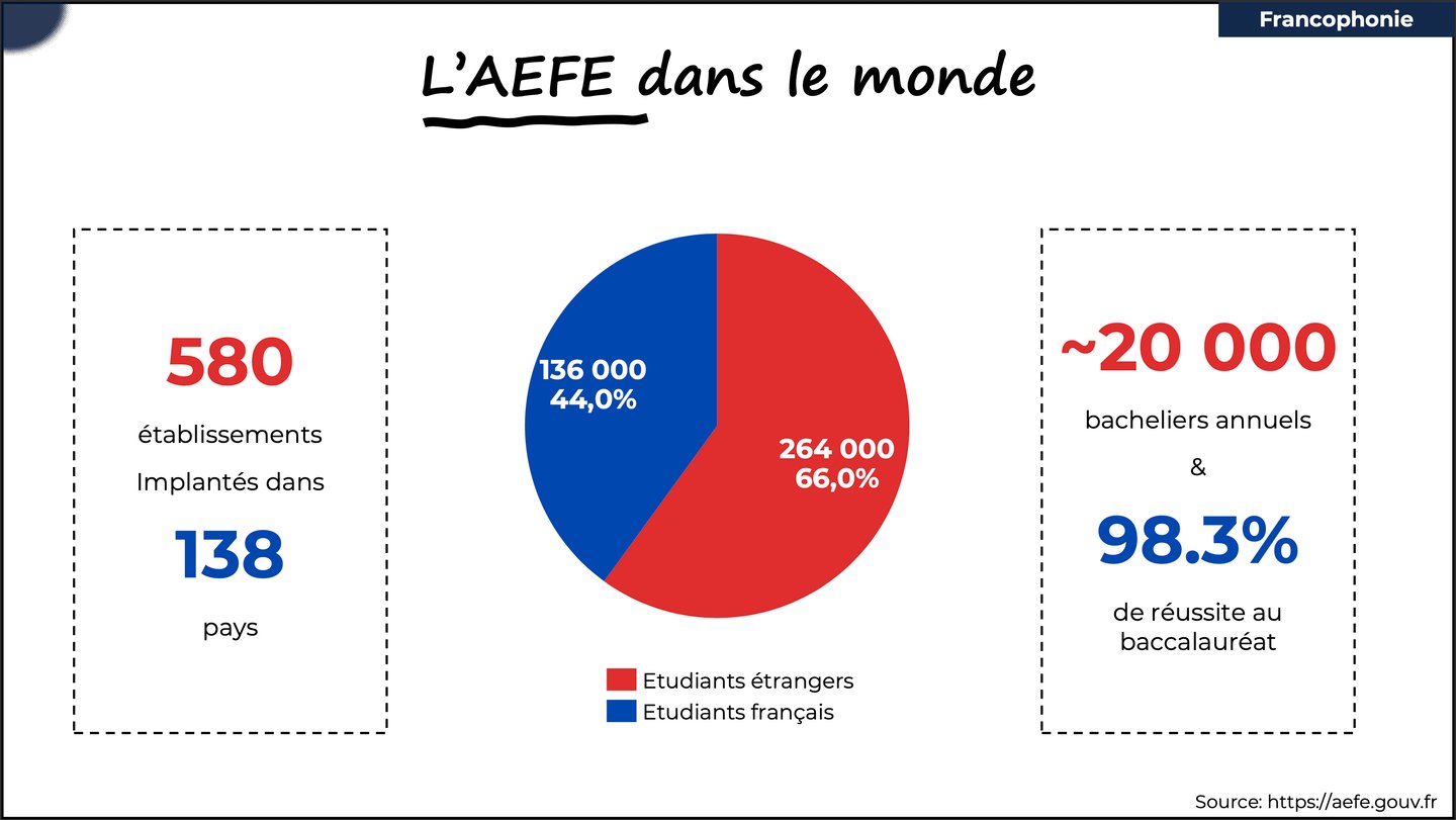 L’AEFE coordonne un réseau de plus de 580 établissements dans environ 140 pays, scolarisant plus de 390 000 élèves, dont un peu plus d’un tiers sont Français.