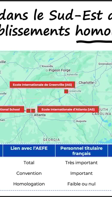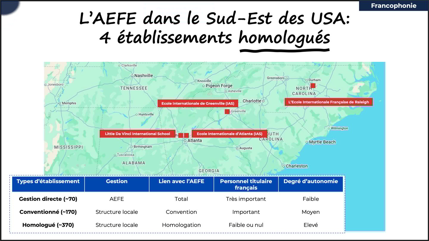 Aux USA, l'AEFE dispose de plus d’une cinquantaine d’établissements avec ~1 300 élèves de plus de 80 nationalités. 4 établissements se trouvent dans le Sud-Est des USA.