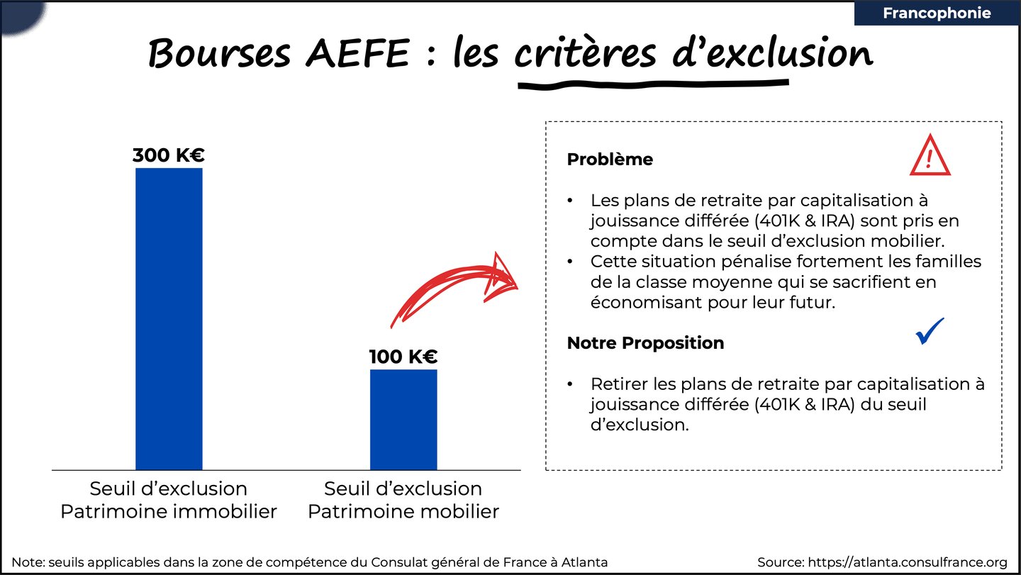Pour les bourses scolaires, retirer les plans de retraite par capitalisation à jouissance différée (401K et IRA) du seuil d'exclusion du patrimoine mobilier, qui pénalise fortement les familles de la classe moyenne qui se sacrifient en économisant pour leur futur.