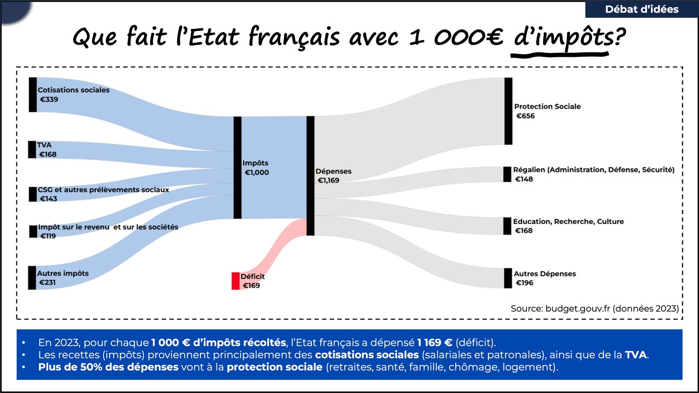 La majeure partie des impôts finance la protection sociale et le fonctionnement de l’État – des dépenses vitales pour le pays mais pas orientées vers le futur et les immenses défis qu’il porte. La France ne peut pas indéfiniment s’endetter pour financer son train de vie. Il est urgent d’investir massivement dans l’enseignement, la recherche, l’industrialisation, la justice, l’armée.