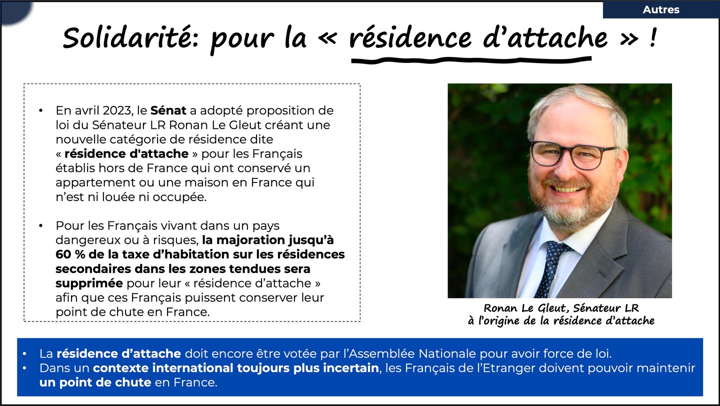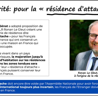 Cette proposition de loi portée par Ronan Le Gleut, sénateur Les Républicains, a été approuvée par le Sénat en 2023. Pour le sénateur Le Gleut, ce logement n’est pas un simple pied-à-terre ou un investissement, mais un lien concret avec la France : un « port d’attache » symbolique et pratique, qui peut aussi servir de refuge ou de résidence de repli en cas de crise dans le pays d’expatriation (conflits, insécurité…).