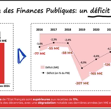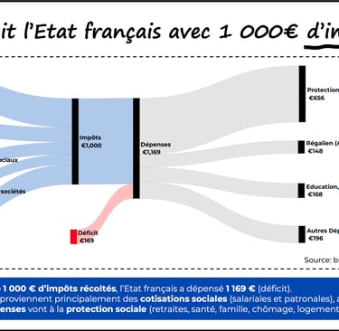 Bien que les prélèvements obligatoires dépassent 50% du PIB, l’État français dépense plus d’argent qu’il n’en dispose, et ce depuis des décennies. En conséquence, le pays et ses générations futures supportent une dette de plus en plus lourde.