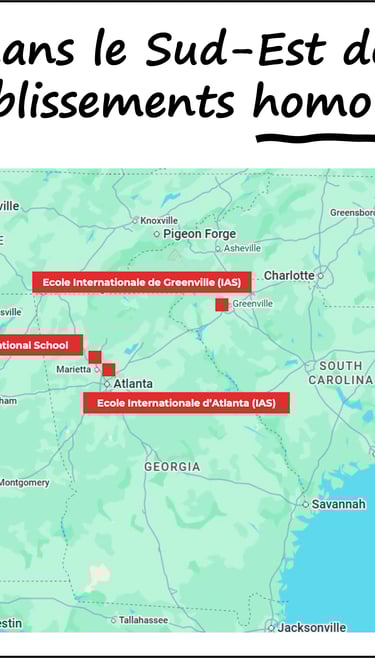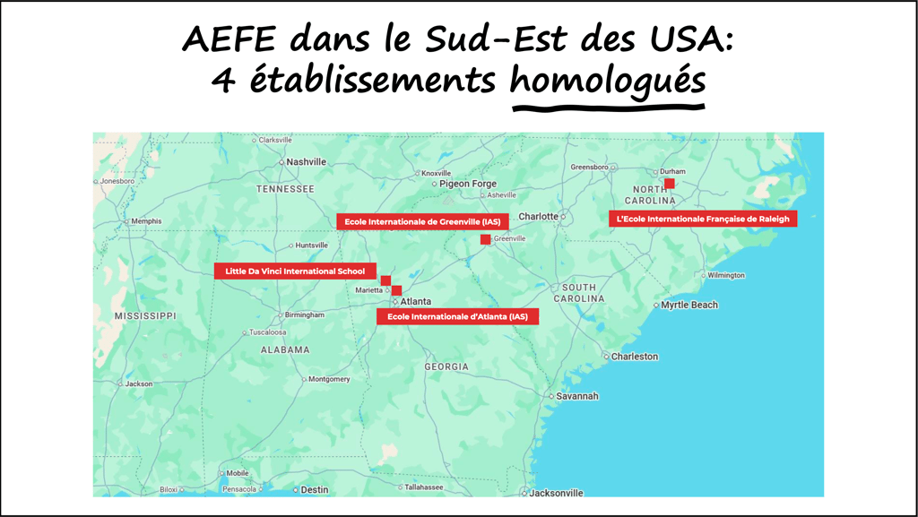 Aux USA, l'AEFE dispose de plus d’une cinquantaine d’établissements avec ~1 300 élèves de plus de 80 nationalités. 4 établissements se trouvent dans le Sud-Est des USA.